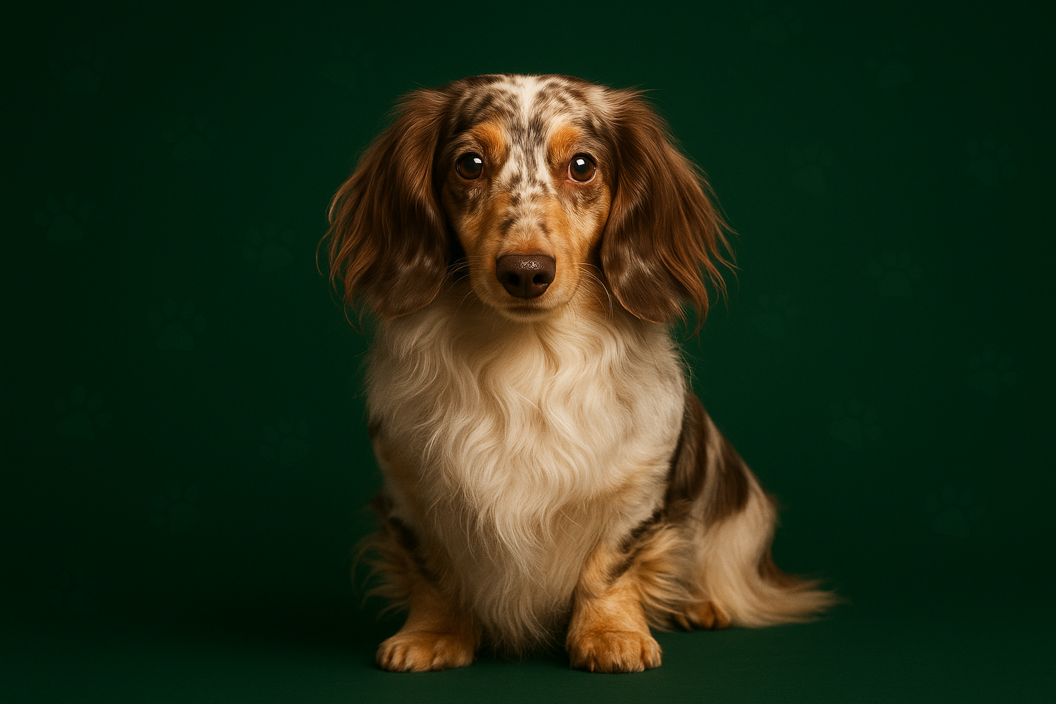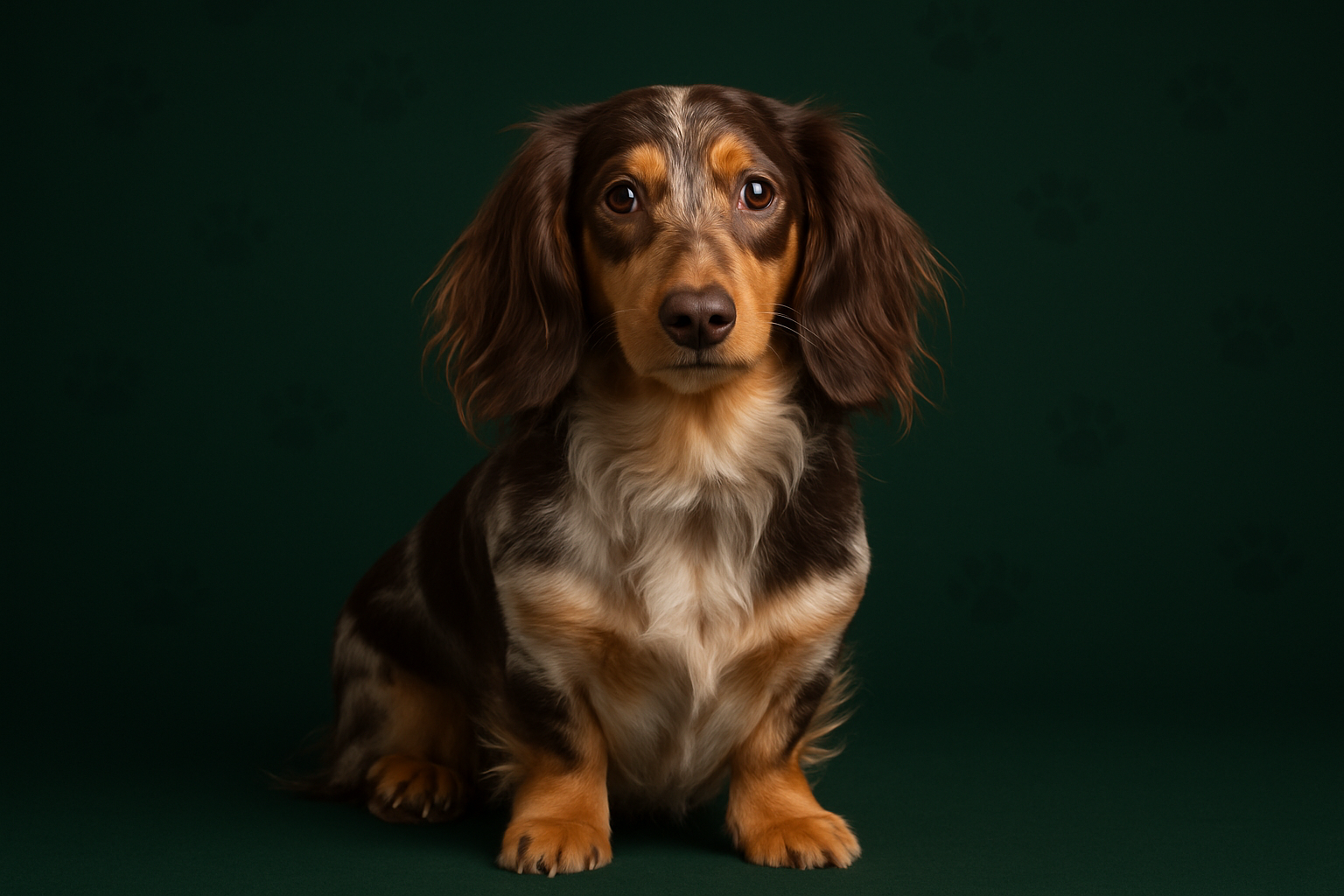 Meet Alfie — the chocolate and tan piebald long-haired dachshund with a mischievous streak and a heart full of joy. He’s playful, fearless, and always finding new ways to make life an adventure.
